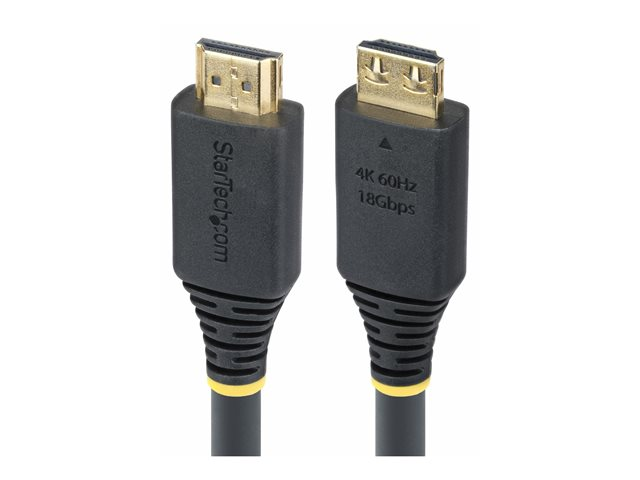 The StarTech.com HDMI2-CABLE-GRIP-7M is designed for longevity and performance, making it a choice for connecting displays, monitors, and TVs. This high-speed HDMI cable features a robust 6 mm diameter and is crafted with aluminum mylar foil shielding, ensuring protection against electromagnetic interference (EMI). With a strain relief feature and gripping connectors, the cable provides a secure fit for reliable connections. It supports an 18 Gbps data rate, enabling video resolutions up to 4K at 60 Hz and 1440p UWQHD at 144 Hz, along with support for Dolby TrueHD and Dolby Atmos audio formats. With a lifespan of up to 10,000 insertions and 2,000 bends, this cable is built to withstand frequent use while maintaining performance.