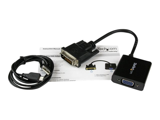This portable adapter works to convert a standard powered DVI bus to VGA, without an external power source. For low-powered DVI ports, a USB cable is included that can power the device from any USB power source.