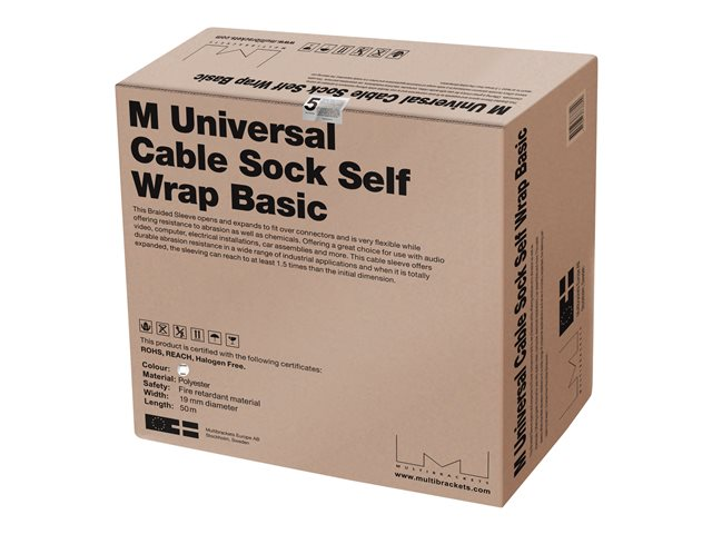 The M Universal Cable Sock Self Wrap Basic is made of knitted polyester of high quality and with a sleek design. It holds any type of cables for example HDMI, CRT, VGA, and more and expands easily.