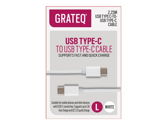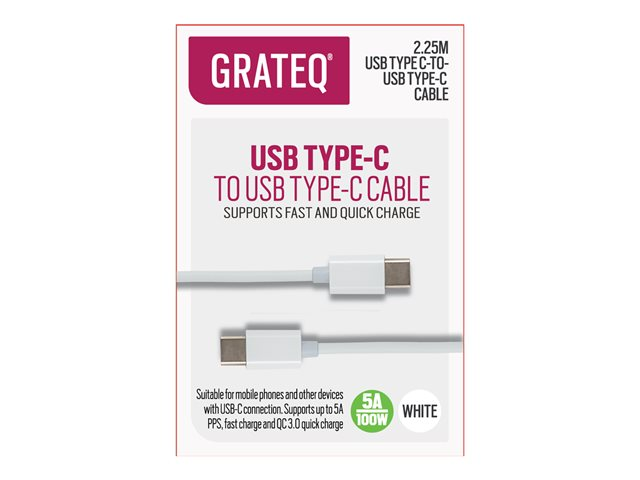 Produktbeskrivelse GRATEQ - USB Type-C kabel - 24 pin USB-C til 24 pin USB-C - 2.25 m Type USB Type-C kabel Egenskaber USB Power Delivery (100 W), Quick Charge 3.0, hurtigtopladende support Kabel længde 2.25 m Forbindelsesled 24 pin USB-C - han Stikforbindelse (anden ende) 24 pin USB-C - han Vurderet strøm 5 A Farve Hvid Producentgaranti 6 måneders garanti -