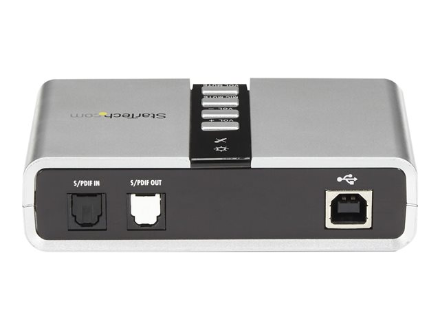 The external USB sound card features easy-to-use volume control and two external microphone inputs - a convenient solution for any audio application requiring high quality sound with multi-input capability with support for 44.1 KHz and 48 KHz sampling rates for analog playback and recording or 48 KHz for SPDIF.