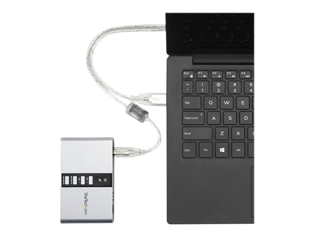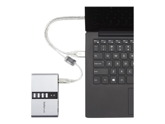 Providing a robust USB audio experience, the USB sound card connects to a host computer through a single USB 2.0 connection, to deliver impressive external audio capability that can instantly be swapped between systems, without having to open the computer case for installation.