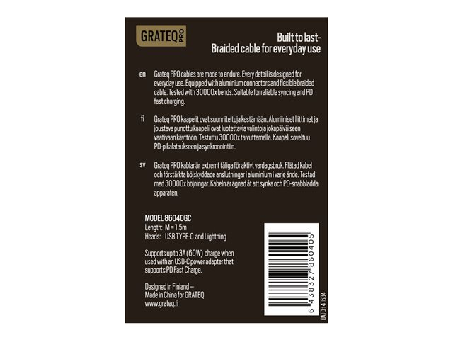 Oplev GRATEQ PRO Lightning-kablet, en robust og effektiv opladningsløsning designet af ALLit Oy. Med en levetid på 30.000 bøjninger er dette kabel bygget til at holde, så du kan bevare forbindelsen, når det betyder mest. Aluminiumsstikkene giver ikke kun en sikker pasform, men forbedrer også kablets holdbarhed. Takket være hurtigopladningsfunktionen og USB Power Delivery på op til 60 W får din iPad, iPhone eller iPod hurtigt strøm, så du er klar til alt, hvad dagen bringer. Derudover understøtter kablet både synkroniserings- og opladningsfunktioner, hvilket giver mulighed for problemfri dataoverførsel uden at afbryde opladningsprocessen. GRATEQ PRO Lightning-kablet er MFi- og RoHS-certificeret og opfylder strenge kvalitetsstandarder, så du kan have ro i sindet ved hver brug.