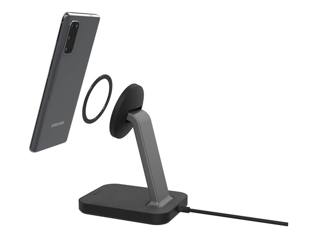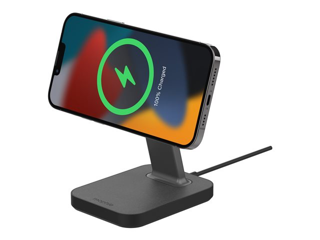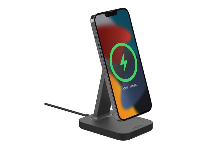 Oplev helt nye muligheder for opladning. Den MagSafe-kompatible snap+ opladningsstander holder din telefon oprejst, mens den trådløst forsynes med op til 7,5 til 15 W. Der medfølger også en adapter, som gør det muligt for telefoner, der ikke er kompatible med MagSafe, at blive fastgjort til standeren magnetisk. Din telefon placeres med det samme det rigtige sted og starter opladningen ved kontakt. snap+ opladningsstanderen holder din telefon over rodet på dit skrivebord, så du kan videochatte, se film eller læse beskeder, mens din telefon oplader.
