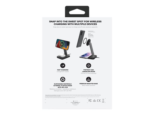 Med den stående, magnetiske snap+ opladningsstander samt opladningspladen kan du oplade din telefon og dine earbuds, så de altid er klar til brug. Standeren holder din enhed stående eller liggende og leverer op 7,5 til 15 W trådløst. Så du kan se en film, videochatte eller læse beskeder, mens din telefon er magnetisk tilsluttet snap+ standeren og opladningspladen. Der er sågar et decideret sted til opladning af dine AirPods.