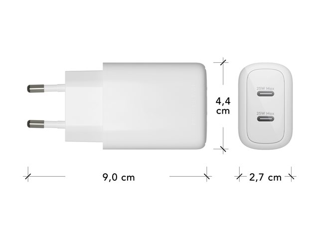 Denne strømadapter er udstyret med GaN-teknologi og leverer 25 watt strøm, samtidig med at den sikrer hurtig opladning. Den giver mulighed for samtidig opladning af op til 2 enheder via de to 24-bens USB-C-udgangsstik. Overophedningsbeskyttelsen sikrer sikkerhed under opladning, hvilket gør den til et pålideligt valg til daglig brug.