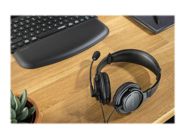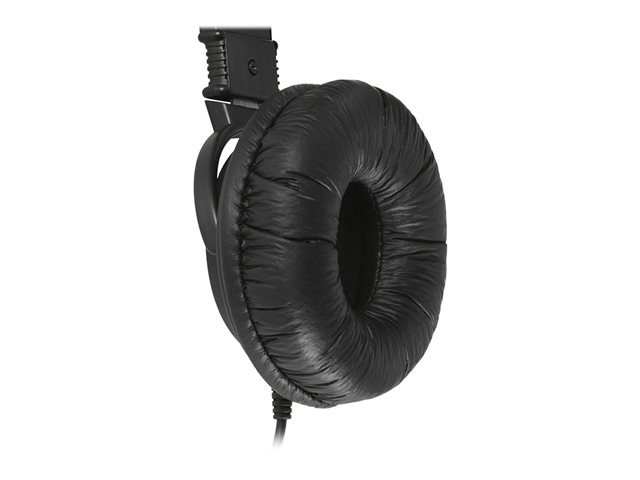 - Designed to fit all ages for universal comfort, the adjustable headband is padded, the flexible boom-style microphone can be rotated up to 270 degrees, and the foam ear pads are wrapped in a soft leatherette cover to provide hours of comfortable use