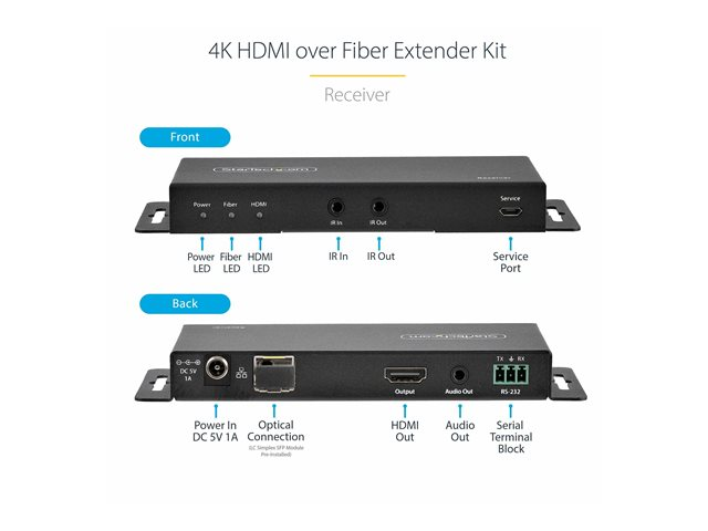 StarTech.com 4K HDMI over Fiber Extender Kit, 4K 60Hz up to 3300ft/1km (Single Mode) or 1000ft/300m (Multimode) LC Fiber Optic, HDR/HDCP, Audio/RS232/IR Extender, HDMI Video Extender