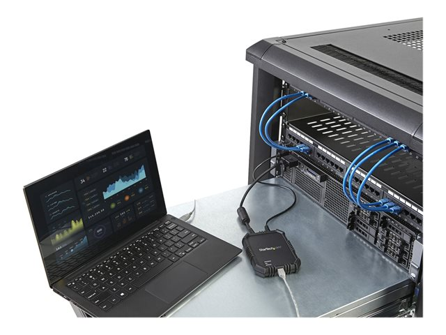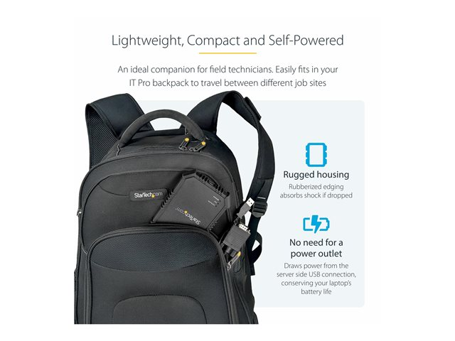 This compact crash cart adapter lets you connect to a headless device using only a laptop, eliminating the need to lug around an awkward, traditional server room crash cart. With optimal portability in mind for your mobile administration or repairs, this pocket-sized adapter features a small footprint and lightweight design that easily fits inside your laptop bag.