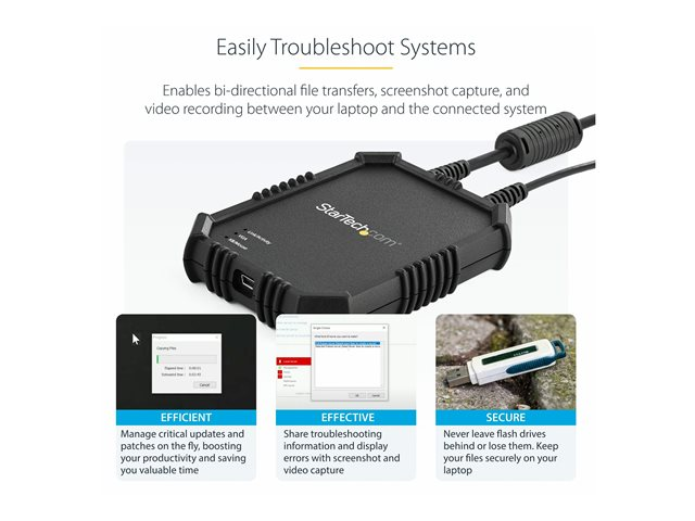 The crash cart adapter features a flexible software interface that offers robust performance. It enables you to transfer files from your laptop to the server, monitor and capture activity from the connected device as video for records or instructional purposes, and take screenshots and scale the display window to full-screen mode or smaller, without scroll bars.