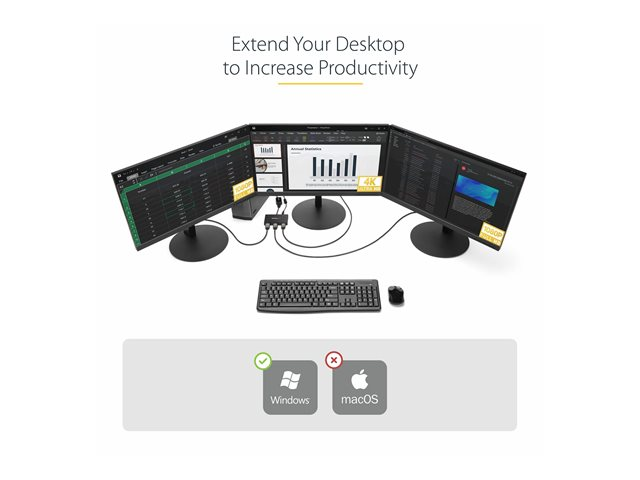 Using the MST hub, you can extend your desktop onto additional monitors and stream independent content to each display. You can also mirror the same image onto multiple HDMI televisions or projectors for remote viewing applications such as digital signage.