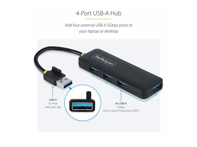 The 4-Port USB-A Hub from StarTech.com offers a seamless USB connectivity solution for various devices. This hub features four USB 3.2 Gen 1 ports, enabling quick data transfer while supporting multiple peripherals. Designed for desktop use, it incorporates a Plug-and-Play capability ensuring easy installation. Additionally, it is equipped with overload current protection for safe operation while maintaining a sturdy performance with a mean time between failures of approximately 24,000 hours. Built to withstand a range of environments, this hub operates efficiently in temperatures from 0°C to 40°C and offers compatibility with USB 1.1, USB 2.0, and USB 3.0 standards, making it a versatile addition to any workspace.