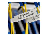 Denne sort/hvide FLe-2511-mærkningstape er ideel til kabelidentifikation og er alsidig. Du skal blot printe din tekst eller stregkode på de to dele af den udstansede etiket. Fastgør etiketstrimlen omkring kablet, tag derefter den udskårne etiket, og sæt den ene halvdel på etiketstrimlen, før du folder den anden halvdel ned.