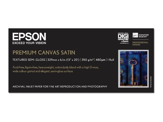 Uanset om det drejer sig om fotografiske portrætter eller reproduktion af kunst, vil Premium Canvas Satin tilfredsstille selv den mest krævende professionelle ved at give både den fineste billedkvalitet og et redskab til øget kreativitet. Dette unikke, tunge kvalitetslærred er fremstillet af en slidstærk blanding af 65 % polyester og 35 % bomuld og har en tæt 2-1-vævning, der er ideel til fotografiske og kunstneriske reproduktioner. Det har en belægning i høj opløsning, som er smidig nok til at kunne strækkes uden at hænge, og det har en subtil tekstur, som giver et ægte kunstnerisk look og fornemmelse. Kombineret med en utrolig farvegengivelse giver Premium Satin-lærred en højglansfinish, øjeblikkelig tør alsidighed og vandbestandighed, så det kan bruges til alle anvendelser, der kræver den højeste billedkvalitet og en arkivholdbar levetid. Da alle farvestoffer, pigmenter og papir ændrer sig over tid, kan Epson ikke garantere dette produkt mod farveændringer og falmning. Epsons ansvar for eventuelle defekter i fremstilling og emballage er begrænset til udskiftningsomkostningerne for dette produkt. Dette papir er certificeret til Digigraphie-brug og er testet af uafhængige laboratorier for at garantere udskrifternes stabilitet over tid. Den komplette liste over certificerede papirer kan findes her.