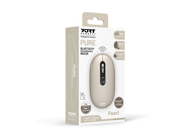 PORT Designs PURE COLOR-musen tilbyder problemfri trådløs forbindelse, hvilket gør den til et velegnet tilbehør til både højre- og venstrehåndede brugere. Denne mus er udstyret med genopladelig lithium-teknologi og har en kapacitet på 500 mAh, hvilket sikrer langvarig brug uden hyppig opladning. Med optisk bevægelsesdetekteringsteknologi med en opløsning på 3200 DPI giver musen præcision og reaktionsevne til forskellige opgaver.