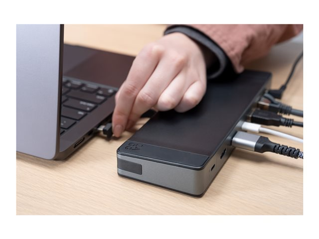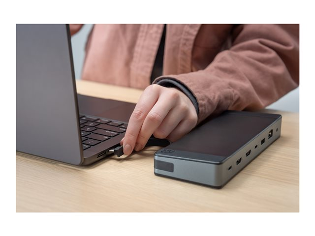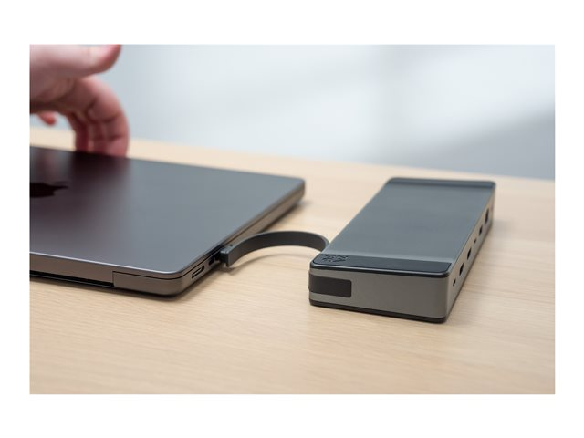 Dockingstationen har to HDMI-udgange til opsætninger med to skærme og plads til både SD- og microSD-hukommelseskort til hurtig dataoverførsel. Tilføjelsen af et kombineret hovedtelefon-/mikrofonstik giver mulighed for lydinput og -output uden behov for separate forbindelser. Denne dockingstation er et vigtigt værktøj til at forbedre produktiviteten og effektiviteten i ethvert miljø.